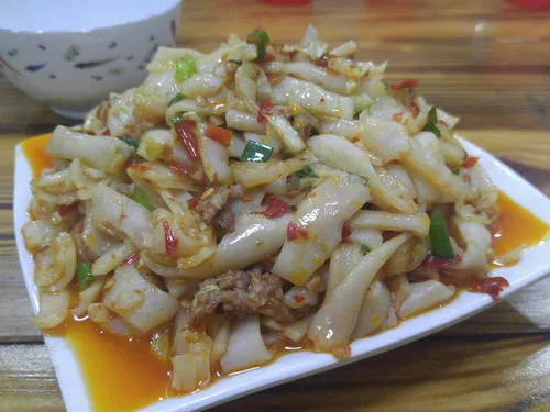 2、再在鍋里放比剛才更多一點的油及一點點鹽(以便讓肉先入鹽味),油熱后將剁肉下鍋翻炒半熟后加入上述蔬菜,(酸腌菜要待其它菜熟了后再加,以免太酸)烹入料酒,醬油及鹽調(diào)味,菜熟后就可以加入先前的卷粉,再輕輕翻炒,出鍋~~~~!