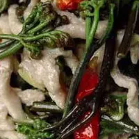 龍爪菜,即蕨菜,盛產(chǎn)于貴州各地。蕨菜又分為甜蕨與苦蕨;甜蕨較小,質(zhì)味最佳;苦蕨較大,有苦味,次之。龍爪菜不宜在新鮮時食用,因其澀,不爽口。宜將用開水水過,再用冷水漂白曬干,即便貯存,其味亦佳。龍爪肉絲是黔菜特有的一種地方傳統(tǒng)名菜,歷時甚久。先將龍爪菜破成絲,切成二寸長,為主料。豬瘦肉洗凈同樣切成二寸長,稍粗于火柴梗的絲,肉絲放入盤中,加少許鹽,水災(zāi)粉碼和,將炒鍋燒熱放少許豬油將肉絲炒散,倒入漏勺濾油,鍋內(nèi)留油約五錢,再將貴陽花溪干辣椒加工成的糍粑辣椒少許,放入鍋內(nèi)煉制,再加上本地生產(chǎn)的豆鼓粑少許燴炒,再下肉絲與龍爪菜,兌上醬油、滋汁、香蔥,一并炒轉(zhuǎn)起鍋即可。此菜有龍爪菜的脆香,色澤紅亮,肉絲鮮嫩微帶辣味,香氣撲鼻,十分可口。是貴州人民最喜愛吃的地方菜肴之一。( 遵義)