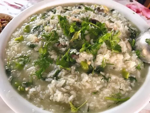 小雞煮稀飯,是佤族普及面最廣、節(jié)慶或待客的最佳粥品。佤族地處云南邊境山區(qū),聚族而居,民風古樸,尊老愛幼,待客如賓。食俗粥上桌后,雞頭必須昂立粥中,由主人將雞頭獻給最尊貴的客人或年長的老人??腿藨?yīng)笑臉相接,不能拒絕,親日品嘗。吃此粥時,必飲低族傳統(tǒng)水酒,其樂融融。嘗粥,五味俱全,鮮甜滋潤,飯菜合一,滋補強身,尤宜老幼體弱者食用。有養(yǎng)肝、滋陰降火,增加奶汁之效。