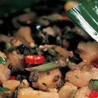 包燒,是西雙版納傣族特殊的一種烹飪食品的方法。用這種方法加工食品不用鍋具,以天然綠葉——芭蕉葉或木冬葉(竹芋科植物)為烹飪工具,將欲烹飪的食物用鮮葉包裹,以火塘的炭火為熱源,將食品燒熟。包燒這種方法,可加工小菜、水鮮、肉食 可包燒的蔬菜有野磨菇、野芋桿、南瓜尖、菜豆甜筍等。每包欲燒蔬菜的原料,需250~300克,加配青椒、鮮姜、蒜、芫荽。主料配料洗凈,切碎,加適量食鹽、味精拌勻,用芭蕉葉或葉包裹嚴(yán)實(shí),用竹篾捆扎后焐在火塘的炭火之下,使其慢慢變熟。包燒的蔬菜,味鮮純、香中略帶辣味(不喜食辣味者,可不加青椒),頗開胃,具有濃郁的鄉(xiāng)野風(fēng)味 包燒水鮮,可取鮮魚鮮、鮮鱔魚鮮蝦作主要原料,重200克、300克均可。配料選取用適量燒熱的青辣椒末或糊辣椒粉、蒜末、姜末、芫荽、苤菜。將欲包燒的水鮮收拾干凈,配料切細(xì),加入適量食鹽、味精拌勻后,填入魚和鱔魚腹腔(鮮蝦只需與配料拌勻),也可用配料包住主料,用鮮芭蕉葉或葉包裹嚴(yán)實(shí),用竹篾捆扎后焐于火塘內(nèi)的炭火之下,至包內(nèi)水鮮燒熟。包燒水鮮,菜包白綠相間,味鮮、香,水鮮原味濃醇 包燒肉類,可用禽肉、蓄肉、獸肉、為主料,用量一般為200克至300克。以青辣椒、姜、蒜、芫荽、苤菜為配料。肉料洗凈剁細(xì),配料洗凈切末,加適量精鹽、味精,將主配料調(diào)合均勻,用芭蕉葉或葉包成長(zhǎng)15公分,寬10公分的肉包,用竹篾捆扎后焐于火塘的炭火之下燒熟。包燒肉類,由于有葉片包裹,營(yíng)養(yǎng)物質(zhì)不易散失,菜色褐紅夾綠,味鮮、醇、香、辣,營(yíng)養(yǎng)豐富。( 西雙版納)