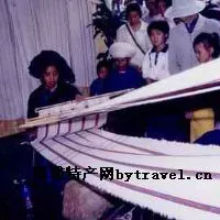 牛肚被:目前還存在于雙江自治縣邦丙鄉(xiāng)大南直村的布朗族紡織工藝精品中的牛肚被,因外形象牛肚而得名,它有里外兩層,做工細(xì)致而繁雜,織一張牛肚被需要15-30天左右的時(shí)間,其制作程序分為軋棉花、彈棉花、搓棉條、紡棉線、繞棉線、煮棉線、圈棉線、拉棉線、織棉線九個(gè)程序。 從地里收回棉花,用自制的壓棉機(jī)去掉棉籽(軋棉花);把經(jīng)脫籽后的棉花用羊弦彈之,使其變軟、變松,同時(shí)達(dá)到祛除灰塵的目的(彈棉花);將彈好的棉花用木棒或稍粗的筷子將棉花搓成花條,以便紡線(搓棉條);將搓好的棉花條在紡線車上紡成一棵棵細(xì)線(紡棉線);然后將線拉成同樣長(zhǎng)的經(jīng)線(繞棉線);為了保持棉線的硬度和牢固性,將繞成經(jīng)線的棉線在裝有小紅米或包谷的大鍋中煮沸,經(jīng)過漂洗后曬干(煮棉線);為使棉線不打死結(jié),方便操作,用紡線車將棉線繞成團(tuán)(圈棉線);用拉線車將繞成團(tuán)的棉線固定在紡線車上(拉棉線);從繞線架拉出的若干股經(jīng)線端用一塊寬約五公分的布帶子固定,系在織布機(jī)手的腰上,當(dāng)右腳踩下踏板,經(jīng)線交錯(cuò)變換一次位置,緯線左右穿一次,線梳前后拉一次,一面用粗棉起絨,一面平織,如此循環(huán)反復(fù),純白的純棉牛肚被就織成了。