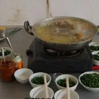 瀘西羊湯鍋選用本地閹過(guò)的壯羊,宰殺后用沸水褪去身上的毛,開膛洗凈內(nèi)臟,用火燎去羊頭、羊腳上的毛,在炭火上烤黃后用錘捶碎內(nèi)骨,最后把肚雜與羊肉一鍋煮。這種吃法的好處是無(wú)膻味、湯白、味濃、肉香,而且營(yíng)養(yǎng)豐富。