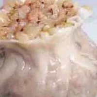 (2)鮮豬肉剁成末,熟豬肉、肉皮剁成粒,三者拌合,加入筍絲未、火腿丁、冬菇絲、蔥花、鹽、味精、胡椒、豬油拌勻成餡心。