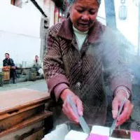 賣(mài)糕的老媽媽,常年就在古街的一隅忙碌著,不需太大的地方,不要太多的工具,也就是一只火爐,爐上一個(gè)盛滿水的鍋不停地冒著騰騰熱氣,鍋蓋上挖出三個(gè)圓洞,圓洞上放上三個(gè)用木片做成的高約5厘米大小如拳頭底尖口圓的小圓甄。每天清早,那位頭發(fā)花白滿臉笑容的老0火爐子就生起了不滅的爐火,等鍋里撲哧撲哧冒著不停的熱氣時(shí),老0雙手也就不停地忙活起來(lái)了。只見(jiàn)她熟練輕靈地將磨好的米面用勺子舀進(jìn)小園甄,甄里的米面在熱氣的蒸騰下變得松軟,還飄著淡淡的米香,隨鍋里的熱氣隱隱鉆進(jìn)你的心房。幾分鐘后,甄里的米糕熟了,老媽媽舀出一勺磨制好的拌有紅砂糖,芝麻,花生面的配料,輕輕灑在糕面上,然后飛快地將一個(gè)小甄拿起,準(zhǔn)確無(wú)誤不差分毫倒扣在另一個(gè)小甄上,這樣,一合米糕就完成了,再在火上蒸大概一分鐘,等夾在其間的砂糖化到恰到好處之時(shí),再將這樣一合米糕從小甄里倒出放在盤(pán)子里,就可以品嘗了。
