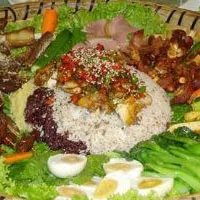 “手抓飯”是富有傈僳族地方風(fēng)味特色的小吃。其選料的方法是:以本地特產(chǎn)的香米煮熟后倒在一個(gè)洗滌干凈的簸箕內(nèi),在米飯上放上切成小塊的黃燜小豬肉、火燒雞、熟火腿和油煎土豆、涼拌魚腥草、清煮南瓜及佐料,然后盛一碗雞湯在每一個(gè)客人前面。