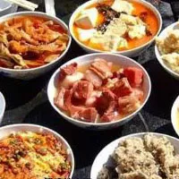 白族紅白喜事宴客中的八大碗是白族傳統(tǒng)飲食文化的集中表現(xiàn)。宴桌是八仙桌(正方形的大理石雕花桌),一般8個人為一桌,菜肴上8個,俗稱“八大碗”。白族土八碗葷素搭配和理,肥而不膩,素而不淡,營養(yǎng)豐富。炸、酥、燉、煮齊全,有蒸有氽,色澤鮮艷多彩,突出白族飲食酸辣口味特色。席面用料簡單,但形式和禮儀隆重,所用器皿一般是本地產(chǎn)的土碗、紅竹筷子等,很少用高檔瓷器,但并不顯得粗糙和簡陋。所用餐桌很考究,一般選用劍川土漆雕花八仙桌,餐桌一般擺在婚禮彩棚下,加上菜肴色澤塔配美觀,顯得古色古香。第一輪先由客人中有聲望的老人入席,俗稱“開席”。此時,嗩吶鼓樂吹奏,主人迎客,氣氛熱鬧,表現(xiàn)了白族尊重老人的傳統(tǒng)美德。席間,客人可分菜和帶菜回家。土八碗中的主菜(葷菜),一般都有定數(shù),每人可吃到兩塊(片)肉,碗中墊底的素菜可加添多次。因此,客人都備有菜葉子(現(xiàn)用塑料食品袋)竹簽將分到的肉包起來或串起來帶回家給老人或小孩吃,寓意為帶回喜氣和福氣>白族土八碗的各道菜各有一套烹飪方法。主菜“紅肉大燉”用肥瘦相間的豬肉切塊,用白酒浸泡的紅曲米將肉染紅燉熟,紅白相間,富有喜氣?!八秩狻笔菍敕拾胧莸呢i肉切塊上調(diào)料,用蛋糊包裹后下油鍋炸至金黃色,冷卻后在煮,,裝碗后撒上些芝麻,黃白相間香氣誘人?!扒埲狻?,即酸菜扣肉,色金紅,味酸甜,肉皮呈波紋狀,外觀爽目?!胺壅羧狻笔菍⑤^肥的五花肉煮熟切片,拌上調(diào)料和炒得噴香的米細粒,裝碗上籠蒸熟,肉肥而不膩,香氣繚繞。“干香”(拼盤)是土八碗中唯一的一碗涼拌菜,將鹵熟的豬肉、肝、肚切片,蓋在用酸菜或泡蘿卜墊底的碗上,淋上又酸又辣的配汁,其味為酸、辣、涼?!爸蟀妆舛埂?、“煮竹筍”、“雜碎湯”是富含碳水化合物、植物纖維素的素菜和湯菜。