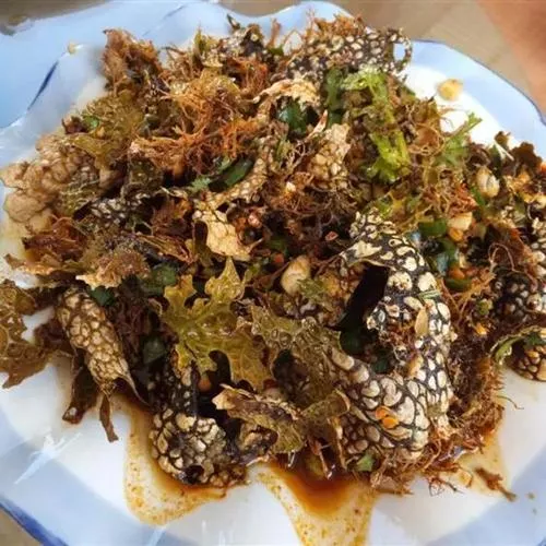 先用開水過一下后,用云南特產小米辣椒和云南特色調料調拌。乍看起來是一大盤青蛙皮狀的東西,上面是翠綠色的花紋,吃起來又酸又辣,第一次品嘗的人可能有點不習慣,但它的口感非常特別,是一種非常舒展的香脆,有股很特別的香味,嚼得越久,香味越持久。