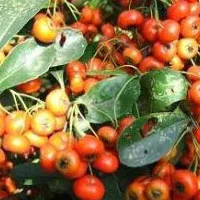 火棘的果實只有黃豆般大小,形狀圓形,它們成團成團集中生長,十分繁密。秋天,火棘成熟后,鮮紅鮮紅,尤其在陽光照射下,更是紅得鮮艷奪目?;鸺數厝擞纸兴熬让Z”,因為這種小果實也可以吃,盡管吃起來酸中帶甜,酸味十足,并有淀粉感。從前,山里人糧食歉產時,秋日火棘成熟后,山民們就要到山里采摘火棘果,采回后用竹箕涼曬干,然后磨成粉面,儲藏至來年青黃不接時,煮粥時將火棘面加添到粥中,以度糧食不夠吃的饑荒季節(jié)?,F在火棘果已失去了昔日的功用,只能是城里孩子嘗新鮮的野果,火棘樹也成了園藝師工人栽盆景的好樹種。