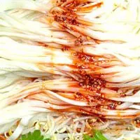 吃時(shí)按需要量分別調(diào)拌,放人綠豆芽、精鹽、芝麻醬、食醋、蒜水、辣椒油,別有風(fēng)味。