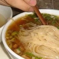 擺湯面有點(diǎn)像過(guò)橋米線。最重要的就是那碗老湯,越是陳年的越好,黑黑的醬油色,上面漂滿切碎的韭菜葉。吃時(shí),夾一小箸面條,放入湯里擺一擺,然后再吃,故名“擺湯面”。