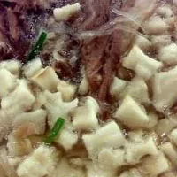 一碗好的泡饃,須先有一鍋煮制成的好湯,好湯的制法當(dāng)然是商業(yè)秘密。只說(shuō)那肉吧,據(jù)行家說(shuō),從開始洗就有講究,有用老井水洗泡,有用流水洗。煮出來(lái)的肉在切之前,老早的講究是要由顧客點(diǎn)選的。筆者曾聽解放前泡饃館的情景:客人掰完饃,伙計(jì)手托擺著肉的案板上前,什么后座(瘦肉)、肚梁搭眼泡,胸口(肉)清肺加肥瘦,依客人自點(diǎn)配肉。那時(shí)吃泡饃肉是肉錢,饃是饃錢??腿它c(diǎn)完吃茶等候,堂倌便依次而唱,例:"樓上三位,頭一碗口湯、肋條搭眼泡……"吃完飯,收帳時(shí)照例要唱頭一碗多少元,第二、三碗多少元,共計(jì)多少元,小費(fèi)多少元。唱完小費(fèi)多少元,全店所有的伙計(jì)都一起朝著客人坐的方向欠身齊喊:"謝!"