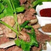 手抓羊肉是積石山各族人民非常喜歡的傳統(tǒng)風(fēng)味名品,因不用筷子用手抓食,故名。選用阜地羊(即本地飼養(yǎng)的棧羊)屠宰,這種肉膘肉相間,肉質(zhì)細(xì)嫩,肥而不膩,味道綿長,少膻腥味。宰后把整羊剁成兩半入鍋加入冷水烹煮,準(zhǔn)確把握火候,先用旺火燒沸,撇去血沫,加入花椒、干姜等調(diào)味品,改由小火慢煮,待血水將干未干之時(shí)撈出,剁為大塊,裝盤上席,手抓醮椒鹽就大蒜而食,味道清爽,鮮香無比?,F(xiàn)在餐館中還開發(fā)成系列手抓羊肉——胸叉、腿子、背子、肋條、尾骨,各部位的肉,嫩、老、肥、瘦、粗、細(xì)各異,獨(dú)具風(fēng)味?,F(xiàn)在,無論是餐廳中還是城鄉(xiāng)宴席上,手抓羊肉是不可缺的一道名菜。