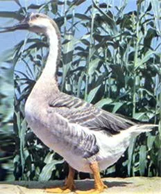 品種特征:公鵝肉瘤較大,呈棱脊形,胸部寬深。母鵝肉瘤小而扁平。羽毛多為灰褐色,純白色占5%左右。灰褐色的成年鵝,從頭部至頸部的背面,有一條深褐色的羽帶。頸部內(nèi)側(cè)至胸、腹部呈灰白色或白色.肉瘤呈黑色或黃色帶黑斑,脛、蹼呈橘黃色。成年公鵝體重4.5千克左右,母鵝 4.0千克左右。
