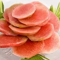 蘭花蘿卜,安徽省無為縣醬品廠腌制蘿卜的傳統(tǒng)產(chǎn)品,以當?shù)仄贩N小長白蘿卜為原料,經(jīng)過加工的成品,具有鮮、咸、脆、嫩等特點,色、香、味、形俱佳。 制作方法: 1.腌制:采用一次重量鹽的腌制法,即每100千克鮮蘿卜頭,腌漬時加食鹽15千克,方法是利用水泥池或大缸,將洗凈泥土的蘿卜倒進一層,并撒一層鹽,第一次用鹽量按每100千克鮮蘿卜用10千克。以后每隔2~3天翻缸一次,共翻缸5~6次,每次翻缸均加撒一些食鹽,共加撒食鹽5千克。每次翻缸剩下的鹵水澄清后仍倒入池(缸)內(nèi)。最上面用大石頭壓緊,池(缸)內(nèi)保持浸沒鹽水10~15厘米深。經(jīng)過10~15天的腌漬,蘿卜頭的外觀有明顯的變化,有彈性,呈玉白色。 2.切花:經(jīng)過腌漬的蘿卜頭,隨時可取出加工。先用清水洗一遍,再放入清水中浸泡24小時,目的是退鹵減少鹽分,然后用鋒利菜刀將蘿卜頭直切一刀,成幾乎相等的兩瓣木梳背形,再在這兩瓣木梳背形上交叉斜刀切劃,形成交叉的菱形花紋,用手拉長后即成蘭花狀,故名“蘭花蘿卜”。 3.醬制:切劃好的蘭花蘿卜瓣,可投入甜醬缸內(nèi)進行醬制。醬內(nèi)可加入糖、八角、五香等配料少許。一般在醬缸內(nèi)浸泡3~5天即為成品。每100千克鮮蘿卜可加工出蘭花蘿卜65~70千克。 產(chǎn)品特點:具有鮮、咸、脆、嫩等特點,色、香、味、形俱佳。