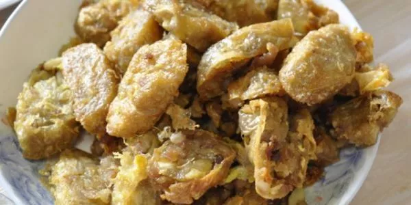 先把瘦肉剁碎,加上香菇、蝦仁、尾梨、冬瓜條、五香、胡椒等佐料,再用豬的網(wǎng)油裹卷,切成半寸左右的圓粒狀,油炸成焦黃色,趁熱沾上醬醋,酥脆香甜、五味俱全。