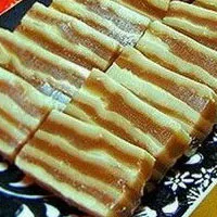 原料需要馬蹄粉(也就是荸薺粉),白糖,牛奶,香草粉,水,可可粉。首先,把馬蹄粉用部分牛奶溶開后,在剩下的牛奶中加入白糖、香草粉,放入鍋中燒開。接著,把燒好的牛奶倒入部分溶開的馬蹄粉中,攪拌至粘稠狀,放入碗中上火蒸熟,制成淺色馬蹄糕。然后在剩下的溶開的馬蹄粉中倒入加有白糖和可可粉后燒開的水,攪拌至粘稠狀,入碗蒸熟制成深色馬蹄糕。兩種顏色的馬蹄糕可以做出各種造型,深淺搭配,非常好看。