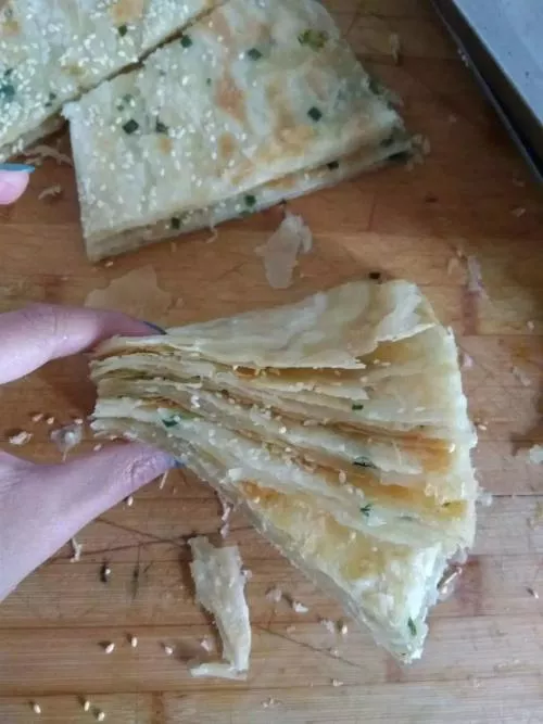 這種餅外邊用一層面皮包起來,而內(nèi)有十?dāng)?shù)層,層層相分,烙熟后,外黃里暄,酥軟油潤,熱食不膩,涼吃不散口,且味道香美。
