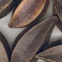 [藥材形性] 呈橢圓形或卵圓形,具5條縱棱,兩端尖,形如梭狀,長約3cm,寬約2cm,紫黑色,平滑微有光澤。體輕,質(zhì)堅硬,橫切面五角星形,中間呈類圓形空腔,內(nèi)有種子一枚。種子紡錘形,長約2cm,直徑約1cm,表面多縱皺,種皮灰黑色或黑褐色,菲薄,易剝離。子葉2片,黃白色,質(zhì)軟,有油性,氣微,味甜,炒后香味較著。