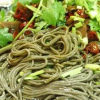 綠豆、大米混合磨漿,在鍋內(nèi)用小火烙成薄片。起鍋晾冷,切成絲狀。吃時(shí),在開水內(nèi)燙熱苯碗,加調(diào)料即可。Pat