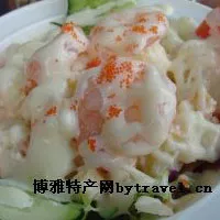 柳橙鮮蝦沙律材料:柳橙(1只)、基圍蝦(10只)、青瓜(半根)、西芹(1/4棵)、紅蘿卜(半根)、圣女果(2粒)、西蘭花(3小朵) 調(diào)料:草莓醬(3湯匙)、沙律醬(4湯匙) 做法: 1、洗凈基圍蝦,放進沸水中燙30秒,撈起剝?nèi)ノr殼,投入冰水中至涼透,撈起蝦仁瀝干水。 2、將西芹、青瓜、紅蘿卜洗凈瀝干水,然后切成丁。 3、燒開半鍋水,倒入切好的西芹、青瓜、紅蘿卜丁和西蘭花,燙1分鐘后撈起瀝干水。 4、加4湯匙沙律醬入碗,連同西芹、青瓜、紅蘿卜丁一起拌勻。 5、把柳橙洗凈后切成花籃狀,挖出橙里的果肉,再削去橙底部一小片果皮,好讓它能斜放于碟上。 6、將水果沙律舀進香橙籃里,裝滿后將剩余的沙律倒在籃邊,舀3湯匙草莓醬平鋪在籃邊,再擺上西蘭花和圣女果。 7、取出擠花袋裝入沙律醬,剪一個小口后,將沙律醬擠在香橙籃上,并在草莓醬上擠一些花紋即可。