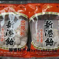 新港飴創(chuàng)始時(shí)原名“老鼠仔糖”,又名“雙仁潤”,系清光緖十七年間(1891),民雄莊江厝店小販盧欺頭所創(chuàng),原來盧老先生在民雄一帶兜售自制的“麥芽糖”及“土豆糖”為生,有一次因連日下雨不歇,無法外出做生意,靈機(jī)一動(dòng),將已潮濕溶化的土豆糖放入剛煮好的麥芽糖內(nèi),使花生仁與麥芽糖混合均勻后,在分開后做成頭小尾尖的小塊,形如小耗子狀,乃稱之為老鼠糖,因名字奇異,又是新花樣,頗為吸引顧客,從此盧欺頭就專做老鼠糖生意。后來因覺名字不雅而易名為雙仁潤(蓋取花生剝開內(nèi)有雙仁之意)。光緒十七年農(nóng)歷三月二十三日新港媽袓廟大拜拜,盧先生挑了許多雙仁潤到新港做生意,因香客眾多,雙仁潤生意很好,且頗受好評,未幾乃遷居新港,在媽祖廟東邊搭建一間木屋,掛出金長利的招牌,并將雙仁潤改稱“新港飴”,盧欺頭也因此成為新港飴的創(chuàng)始者。其后幾經(jīng)改良,遂使新港飴聲名遠(yuǎn)播,繼而又創(chuàng)造芭蕉飴(原名為芎蕉糕)、桂圓飴、葡萄飴、梅仔飴、李仔飴等姐妹品數(shù)種。