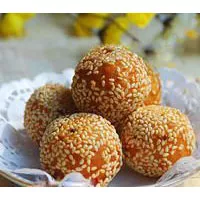 餡料有花生糖、椰蓉、豆蓉、冬瓜糖果、椰子絲、芝麻、肉丁和冬瓜糖等,接著把芝麻灑在團(tuán)子表皮上,放進(jìn)油鍋里炸,油最好是椰子油或花生油。油炸時(shí),邊炸邊不停地翻動(dòng),使其厚薄一致,圓圓勻稱,幾分鐘后撈起,涼一會(huì)再炸,如此三、四次,直到表皮呈金燦燦的。