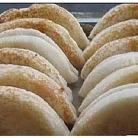 硬糜子去殼,用水浸泡、瀝水、磨粉、過(guò)籮,四分之一面粉用開(kāi)水燙成糊放在鍋中蒸熟,將蒸熟的面糊和剩余的面粉和在一起,放入盆中發(fā)酵,發(fā)酵好后加適量堿水,用水和成面糊待用。將黃煎鏊(黃煎鏊呈圓形,鍋底中部向上凸起,以便面糊自動(dòng)平鋪鍋底)放到火上,在鍋底摸適量的食用油,以防粘鍋,待油熱后,舀一小勺和好的面糊倒入熱鍋中,然后加上鍋蓋,約三分鐘左右可熟,揭開(kāi)鍋蓋,用鏟子將黃煎對(duì)折取出即可食用。做好的黃煎色澤金黃,邊緣厚中部薄,味甜而可口。