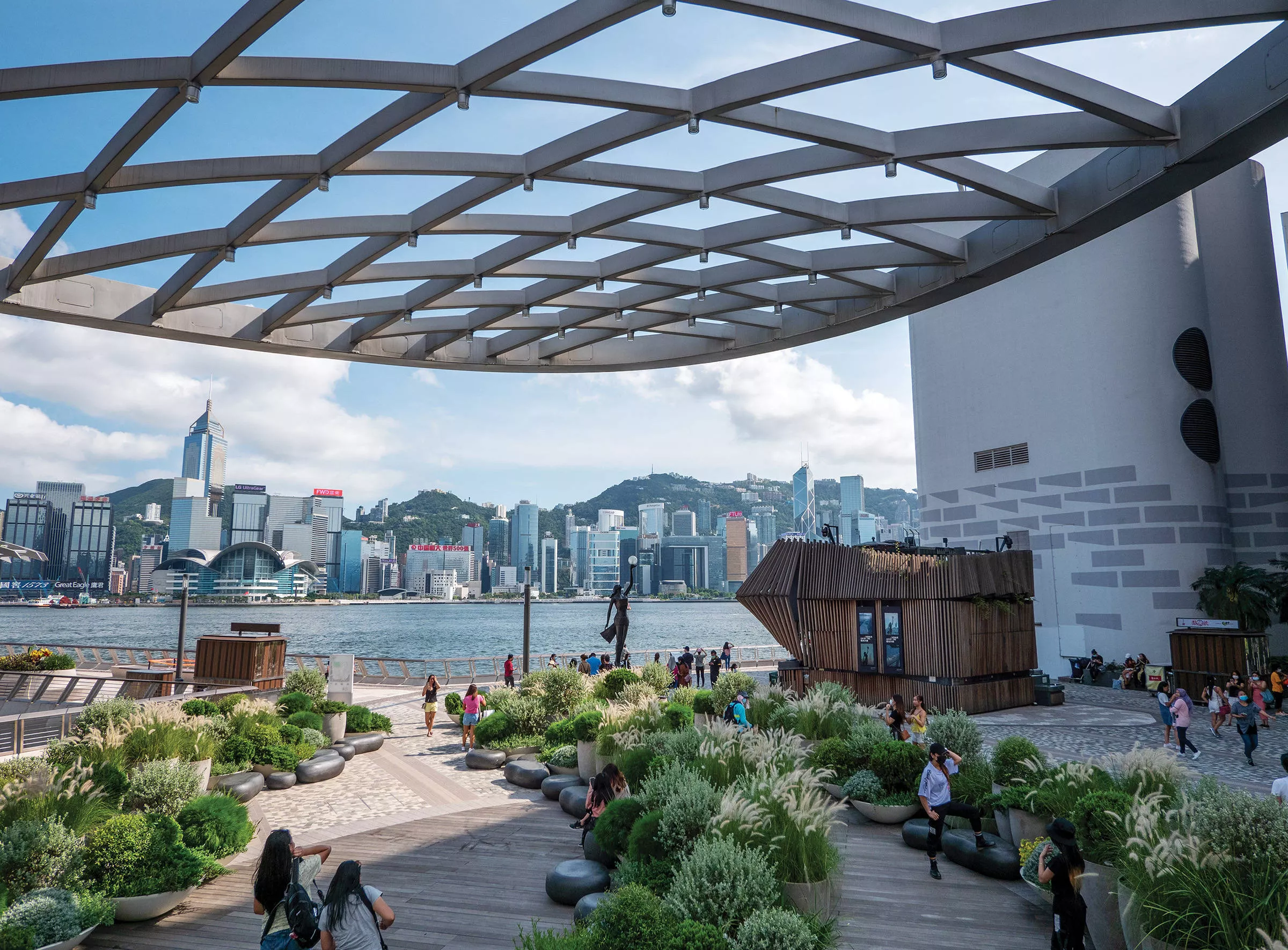 如果將視線聚焦至香港的新藝文地標——西九文化區(qū),就可發(fā)現(xiàn)這里有著大片綠地。郁郁蔥蔥的植物環(huán)繞著一幢幢極具藝術氣質的建筑物,與四周鋼筋水泥的現(xiàn)代化建筑群形成了鮮明的對比。作為城市中的天然氧吧,這里也是人們走出戶外、呼吸新鮮空氣、欣賞海景的好去處。