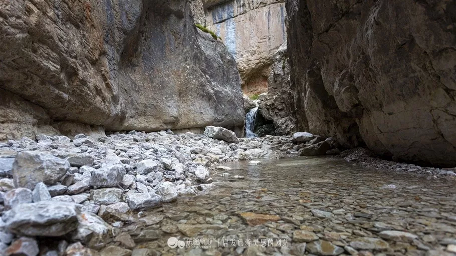 穿過(guò)一片巖羊踩過(guò)的腳印,是一個(gè)一線天式的峽谷,峽谷中有泉水流出。從下圖中的小瀑布往上還有一個(gè)很大的平臺(tái),泉水是從那里面流出來(lái)的,因?yàn)闀r(shí)間不足和裝備不夠,沒(méi)有攀爬到那個(gè)平臺(tái)上去。