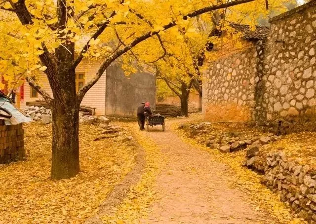 每到深秋季節(jié),微風(fēng)輕拂,落葉繽紛,樹上的、樹下的,一片片落葉就象一片片黃金,與林下拾葉子的老人或孩童,構(gòu)成一幅幅別有韻味的秋意圖。