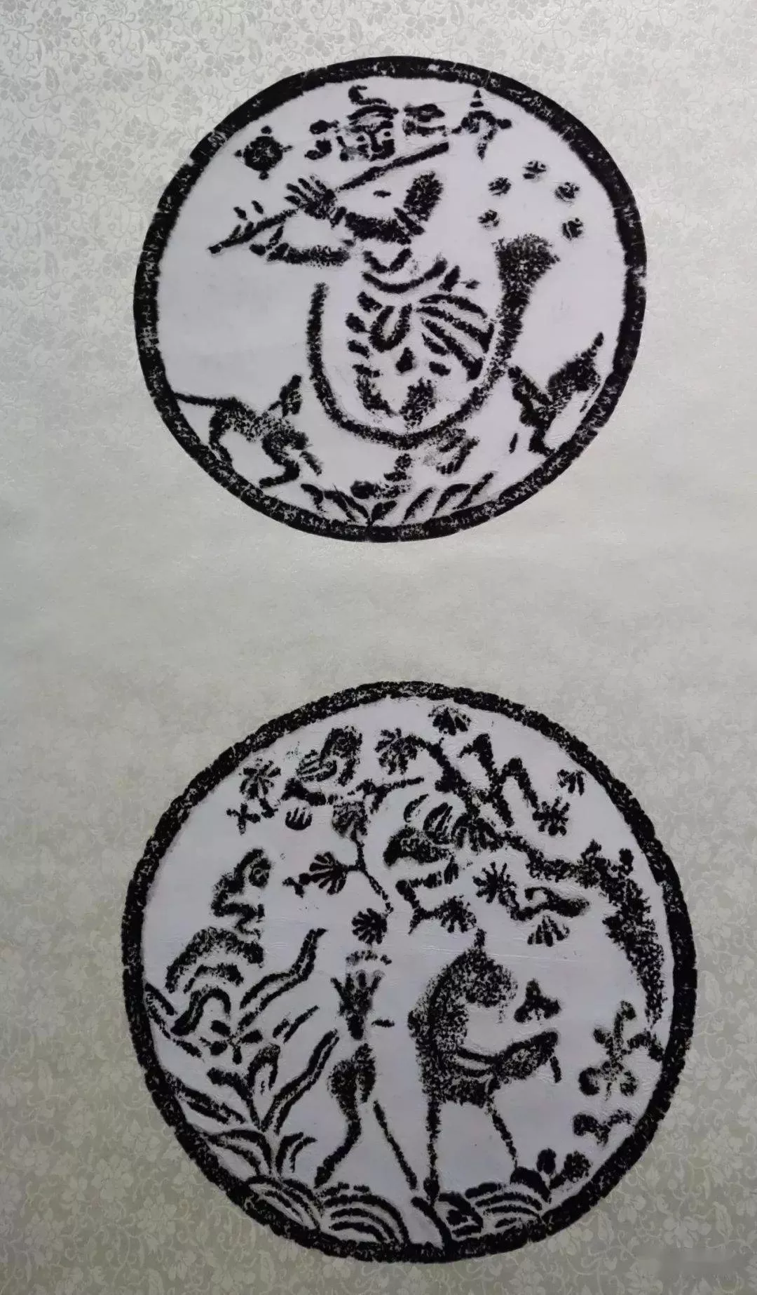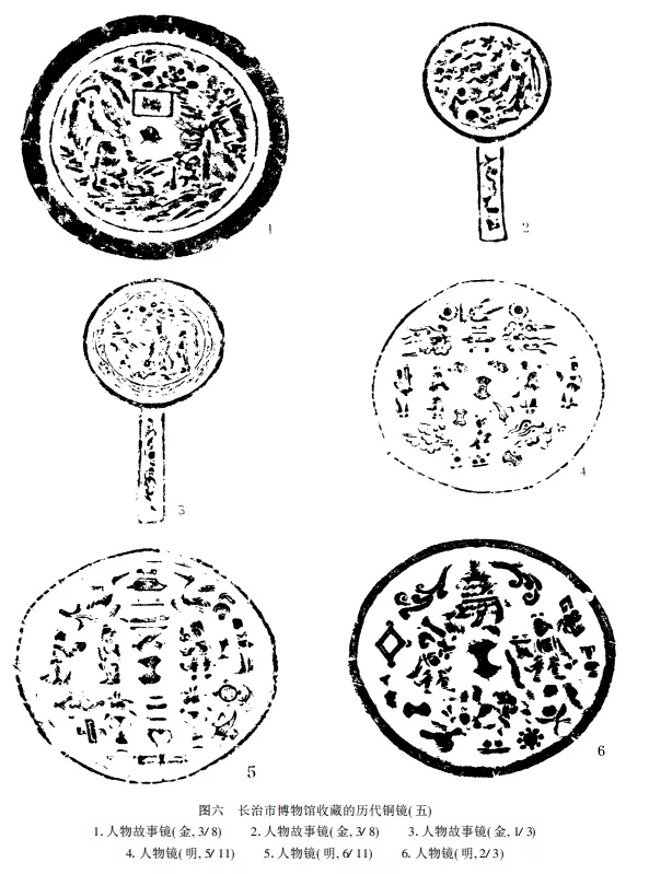 人物故事鏡3件。一件直徑16.2、緣厚0.4厘米。圓鈕,鈕上部飾折枝牡丹,牡丹下一方框,鈕兩側(cè)飾高山懸崖,鈕左下方一人盤膝坐于石上,作仰首遠眺狀,其下飾水波紋,近緣處飾弦紋一周,素寬平緣(圖六,1)。另一件圓形帶柄,長14.5、寬7.9、緣厚0.4厘米。鏡背右側(cè)飾修竹兩株,枝葉沿鏡緣伸延至頂,上部有祥云、飛鶴,下部一婦人執(zhí)扇,扇柄指向前面欲作跪拜狀的小兒,兩人之間飾一兔子,似為“孟母教子”故事。鏡柄飾梅、鹿圖案(圖六,2)。第三件圓形帶柄,長19.4、寬9.9、緣厚0.6厘米。鏡背右側(cè)站立兩人,前面一人寬衣博帶,身軀高大似為主人,身后一人身材矮小,手執(zhí)一物似寶幡,二人身后一株花樹伸延過頂;左側(cè)上部飾紅日、仙鶴、祥云,其下為水波紋,一龜在波中伸頸昂首似聽教誨,近緣處雙線紋內(nèi)飾纏枝紋。鏡柄飾流云(圖六,3)。以上三件均為1975年晉東南農(nóng)產(chǎn)品公司揀選。