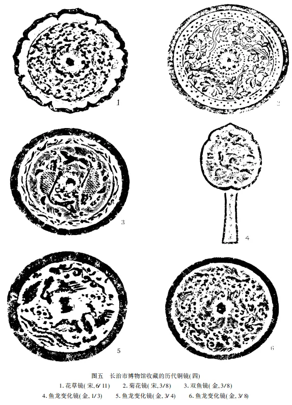 魚龍變化鏡3件。一件桃形帶柄,長19.5、寬9.2、緣厚0.6厘米。鏡背上部飾祥云托月,下部飾一龍首魚身展雙翼的異獸,在波濤中呈展翅飛躍狀,素窄緣。1973年晉東南外貿(mào)揀選(圖五,4)。另一件直徑7.7、緣厚0.5厘米。圓形,橋形鈕,鏡背飾波浪紋,鈕兩側(cè)各一龍首魚身有雙翼的異獸在波濤中呈展翅飛躍狀,素寬平緣(圖五,5)。第三件,直徑14.4、緣厚0.6厘米。圓鈕,鏡背滿布波浪紋,波中飾龍首魚身有雙翼的異獸出沒其中,素寬緣(圖五,6)。以上二件為1980年長治市回收公司大庫揀選。