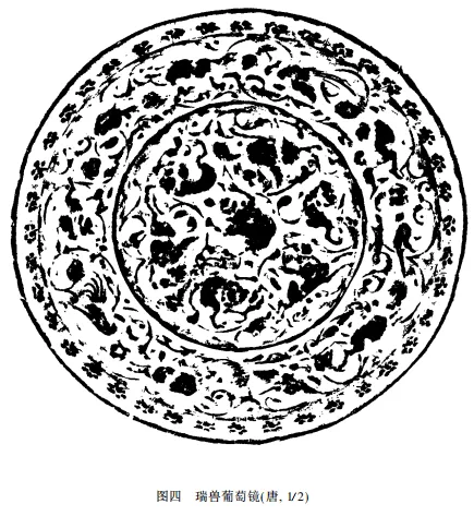 瑞獸葡萄鏡1件。直徑22.1、緣厚1.3厘米。獸鈕,鈕背鏨刻“張”字,弦紋一周將鏡背分為內(nèi)外兩區(qū),內(nèi)區(qū)飾姿式各異的六瑞獸攀援葡萄蔓枝葉實;外區(qū)為葡萄蔓枝葉實與飛禽、走獸相間,近緣處飾花瓣紋一周,窄緣。1979年長子縣收購站揀選(圖四)。