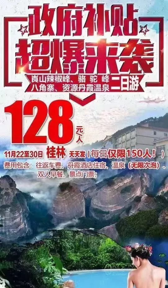 11月25-26日(周一-周二)11月27-28日(周三-周四)11月29-30日(周五-周六)政府補(bǔ)貼,特惠128+2元意外險(xiǎn)!每期限150人,先報(bào)先得!政府補(bǔ)貼,泡溫泉啦!崀山風(fēng)景區(qū)崀山風(fēng)景名勝區(qū)位于湖南省邵陽(yáng)市新寧縣境內(nèi),包括天一巷、辣椒峰、夫夷江、八角寨、紫霞峒、天生橋六大景區(qū),18處風(fēng)景小區(qū),已發(fā)現(xiàn)和命名的重要景點(diǎn)有500余處,有三大溶洞