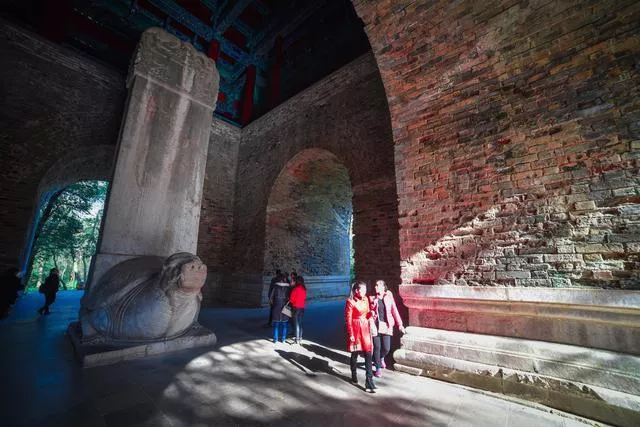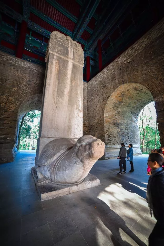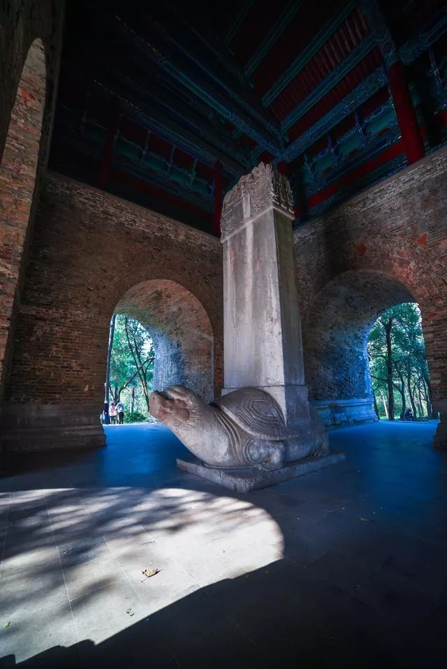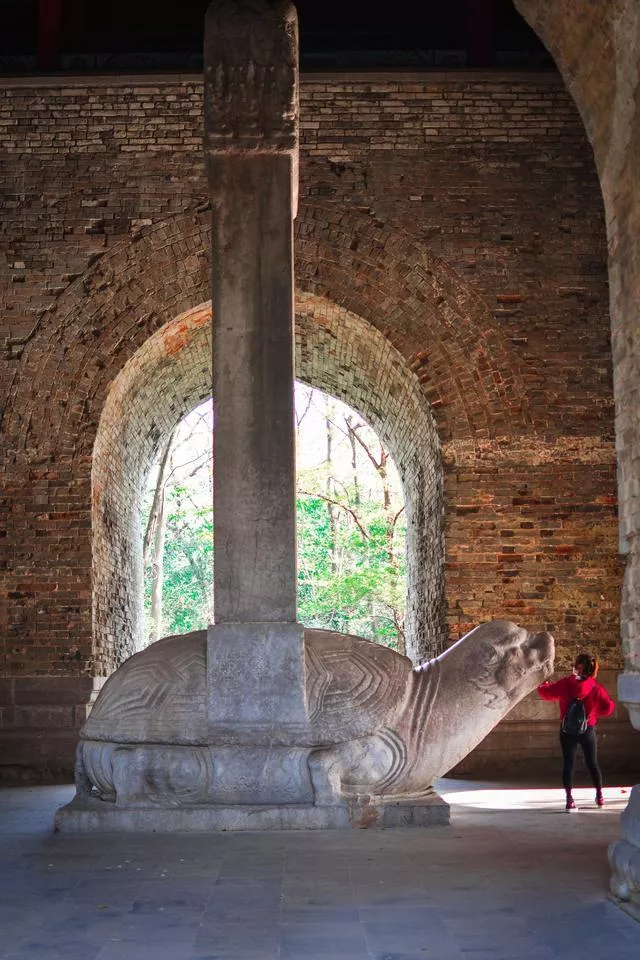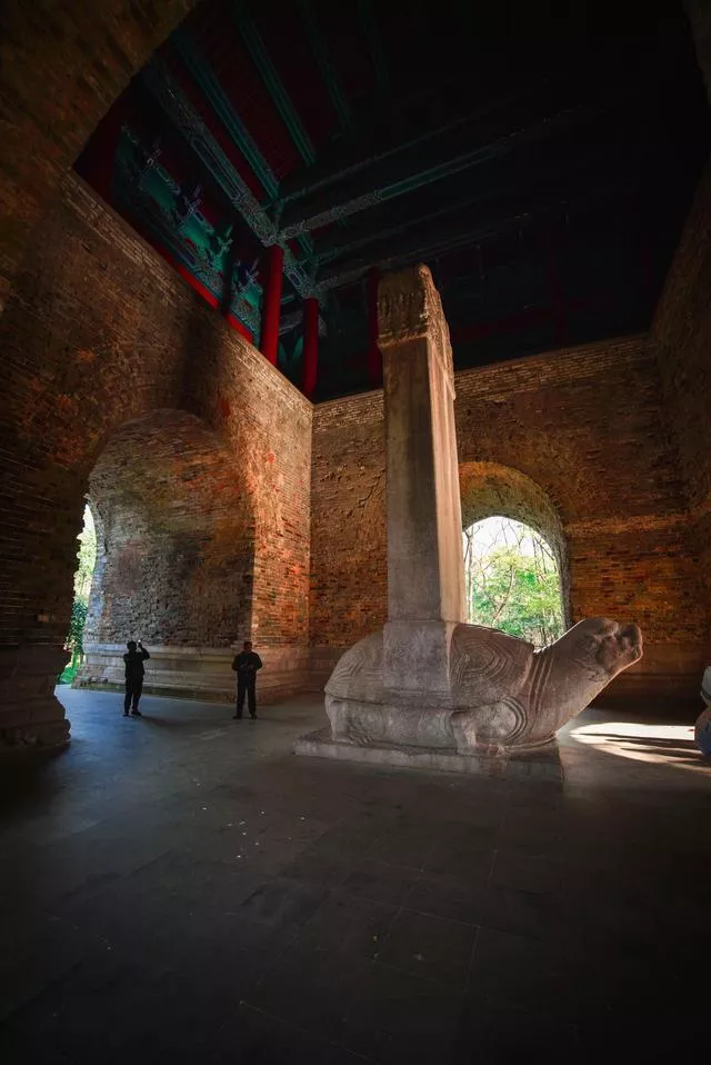 方城掩映在濃密的樹叢中古樸而寧?kù)o,難得沒(méi)有圈在景區(qū)之內(nèi),從這里穿過(guò)的路人都會(huì)去摸赑屃的頭,求福報(bào)。赑屃背上的神功圣德碑是明朝永樂(lè)皇帝朱棣為父親洪武皇帝朱元璋親撰的碑記,共2746字,詳述太祖一生功德。