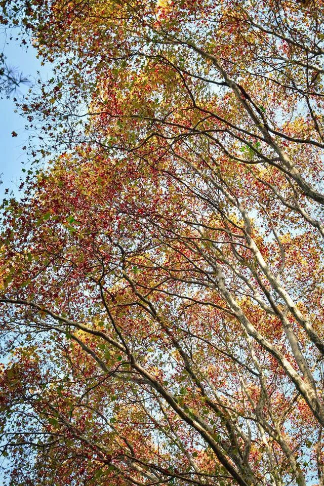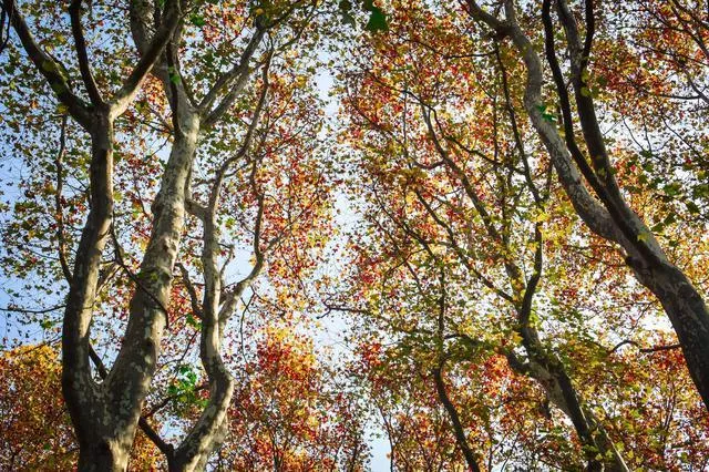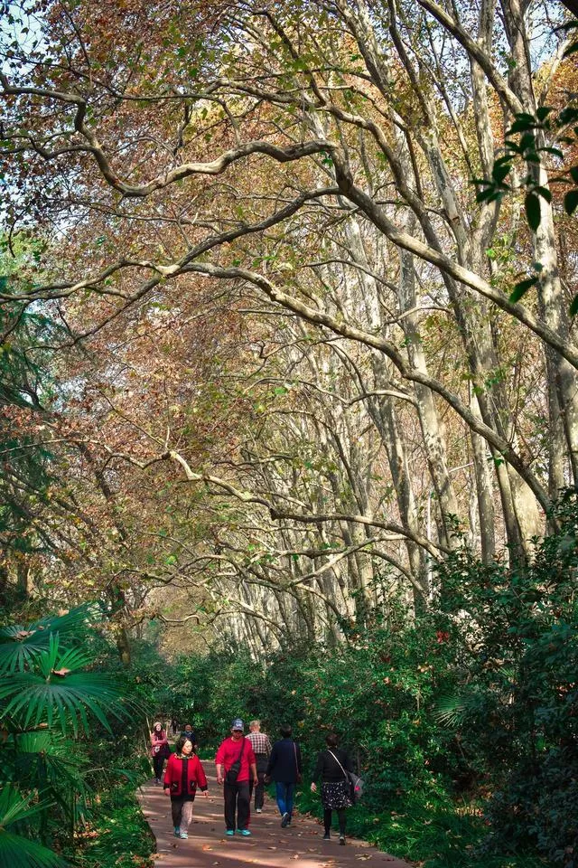 乘坐地鐵2號(hào)線,從苜蓿園站出來(lái),順著步道拐入陵園路,走進(jìn)法桐的世界。遮天蔽日的法桐是紫金山的外衣,樹冠使勁向天空伸展,光滑的的樹干好似纖細(xì)的手臂,一簇簇交叉合攏成千手觀音。隨著季節(jié)變化,法桐樹葉五彩斑斕,太陽(yáng)從樹葉的縫隙中穿過(guò)交織出縷縷光幕灑在步道上,為路人增添情趣。