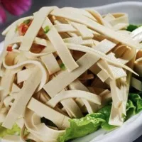 金牛千張皮,是黃石境內大冶金牛鎮(zhèn)內的一種傳統(tǒng)小吃。當?shù)厍埰さ闹谱鞴に囀种v究,主要以黃豆為原料,制作時先將黃豆制作成豆腐腦,再用竹具攪勻,用瓢澆進跟布巾大小的木匣上,每澆1層就蓋1層棉布片,然后再用木杠將略小于木匣的木頭壓進匣內,將水榨干,再把布巾從匣內取出來,用水輕輕地一層層剝下來,每10張為1把,豆皮兩面的皮紋清晰可見,恰似一塊長方形的手帕即成。當?shù)厍埰さ某苑ǘ鄻?,能做出各種美味佳肴,最常見的吃法就是切成絲煮鮮魚,味道鮮美,尤以鱖魚煮皮子遠近聞名。