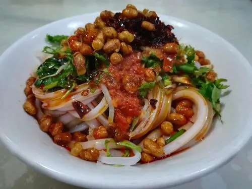 興義剪粉是貴州黔西南州興義市著名的特色小吃,以其具有薄、軟、韌性好、口味佳特點,聞名全州及省內外,歷史悠久,據傳已有上千年的歷史,其制作是精選優(yōu)質大米,浸泡后不加任何添加劑,經磨漿、勾兌、蒸熟、冷卻等程序制成色澤潔白、厚薄均勻的剪粉,再配上優(yōu)質菜油制作的辣椒油、花椒油,芝麻醬、花生醬,大頭菜、香蔥、芫荽、酥豆及鮮脆的綠豆芽佐之而成的粉。剪粉是興義人很喜愛的小吃,尤其是夏天,吃上一碗涼剪粉,既解饞又消暑。小編推薦去興義聶氏家傳剪粉品嘗“興義剪粉”,他家以傳統(tǒng)手工藝制作,至今已有90多年的歷史?!?br />