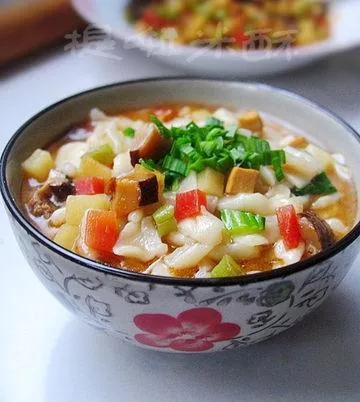 天水燴麻食是甘肅天水一種傳統(tǒng)的特色小吃,其特點(diǎn)是菜食合一、筋韌爽滑、鮮咸適口、色澤美觀、易消化。燴麻食制作起來頗有講究,用面粉加水調(diào)和成面團(tuán),揉透略餳,搓成條狀每次掐一小點(diǎn),用大拇指搓片后卷成一個(gè)個(gè)小海螺狀。再將黃花、豬肉、豆腐、蘿卜、雞肉、火腿、青菜等配菜皆切成小丁,蔥、姜切成絲。鍋內(nèi)加入少許清油,燒熱用蔥姜絲爆香,加入黃豆、木耳、黃花、豬肉、豆腐、蘿卜、雞肉、火腿、青菜等各種原料,煸炒至七成熱,加入肉湯、精鹽、醬油、醋、味精,燒開后加入麻食生坯一同燴煮至湯濃時(shí)即成。據(jù)MAIgoo美食小編了解,天水燴麻