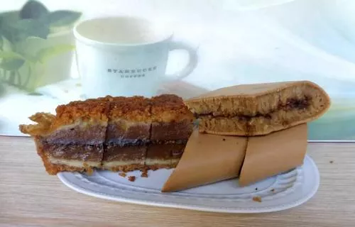 漳州面煎粿,又叫滿煎粿,是漳州一道色香味俱全的美食小吃,是一種極具閩南特色的名小吃,也是福建著名的特色風(fēng)味小吃,因?yàn)樵诩逯七^程中面糊會(huì)“脹滿”整個(gè)平底煎鍋而得此名。金黃色的油炸皮,深棕色的粿餡,最中間還夾著一層料。輕輕地咬一口,皮脆餡軟,味道香甜,吃后口有余香。面煎粿的原料為地瓜粉、面粉、赤砂糖、桂花露、花生、黑芝麻、冬瓜條。以地瓜粉加水?dāng)嚢璩蓾{料做皮,以面粉加赤砂糖水?dāng)嚢璩蓾{料做餡,再配上佐料。面煎粿內(nèi)里夾著面香、花生的味道,更有桂花的馥郁,淺淺盈口,既綿軟且香甜,細(xì)細(xì)咀嚼,是一種“古早”的滋味。面煎粿