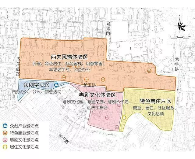 結合廣州市嶺南文化中心區(qū)(荔灣片區(qū))發(fā)展規(guī)劃,北岸嶺南文化傳統(tǒng)風貌區(qū)及西關歷史城區(qū)七大特色功能區(qū)規(guī)劃,發(fā)掘多寶路歷史文化街區(qū)特色價值。以文化為脈絡,建筑為媒介,形成西關風情體驗區(qū)、粵劇文化體驗區(qū)、眾創(chuàng)空間、特色商住區(qū)四類功能區(qū)。