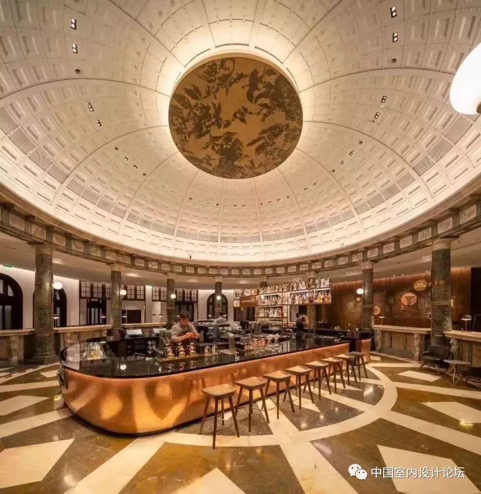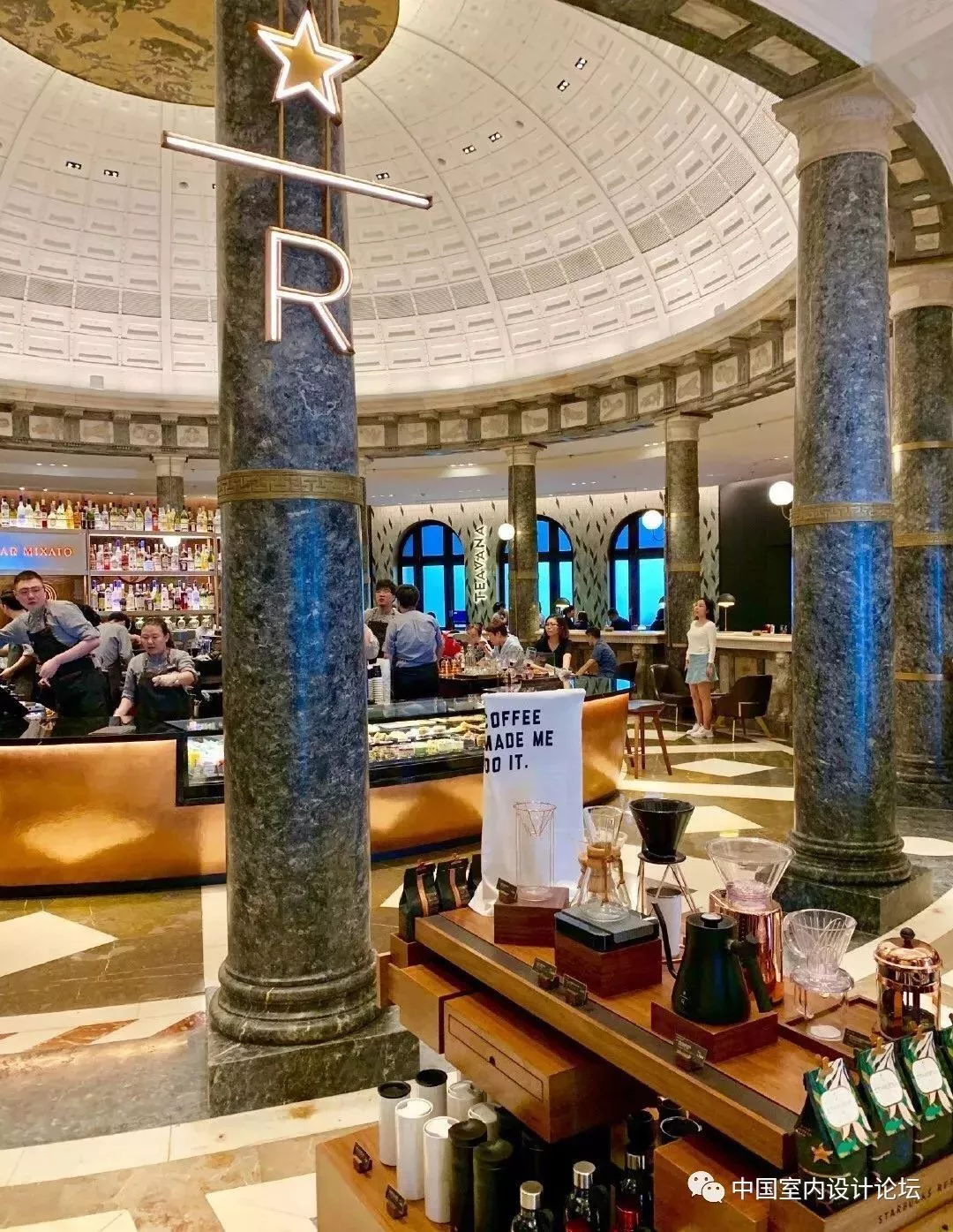 幾何天花板采用數(shù)字化設(shè)計,創(chuàng)造了從歷史到未來的落地式融合。地板采用馬賽克大理石材料,并且運用傳統(tǒng)的Palladianan風(fēng)格手工制作。這家星巴克的設(shè)計從整體到細節(jié)設(shè)計,都是十分匠心的設(shè)計參考。