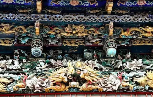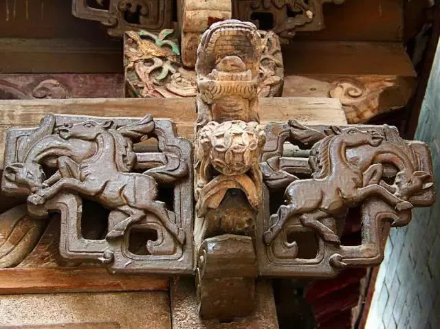 院內(nèi)隨處可見木雕、磚雕、石雕,從屋檐、斗拱、照壁、獸吻到石鼓、門窗等均構(gòu)思奇妙,造型逼真。