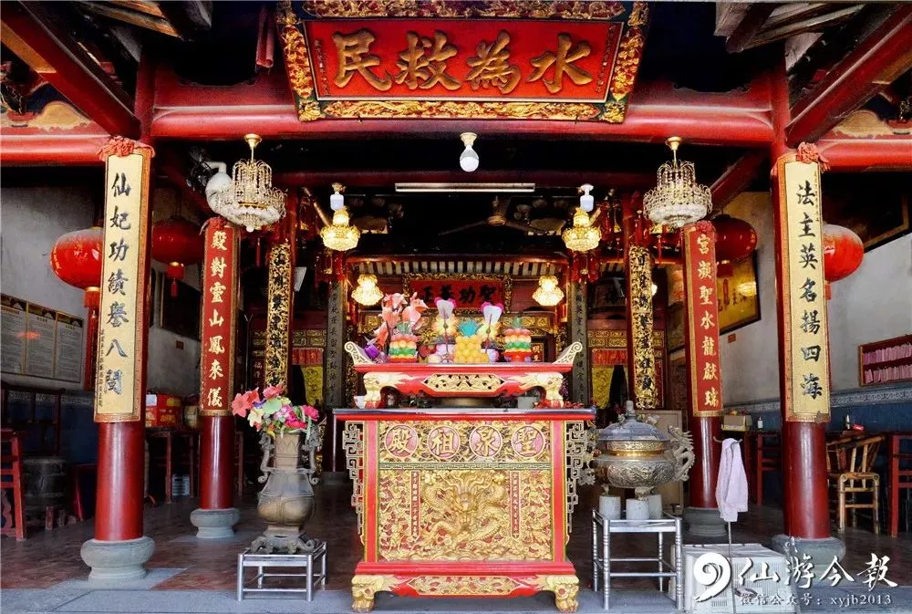 法主圣妃,俗姓許,又稱許仙姑,云游四方,唐昭宗乾寧間經(jīng)入仙游,行至鞏橋鄭宅,視此間鐘靈毓秀,乃向鄭家祖媽求賜宅地。鄭家祖媽慨然與之,并寄望仙姑助修水利,造福后代,以拯萬民。圣妃概然相許。后唐明宗長(zhǎng)興元年(930年),唐御史中丞鄭良士長(zhǎng)子禮部尚書鄭元弼公,為感念許仙姑興修水利,濟(jì)世救民的功勛,特舍地捐資在草廬原址上創(chuàng)建宮殿,號(hào)“圣泉宮”,又稱“圣泉祖殿”,奉祀許氏仙姑,尊稱圣泉媽,后敕封為法主仙妃,分靈宮又稱圣祖媽、圣祖娘娘、圣祖仙姬、法主娘娘等。