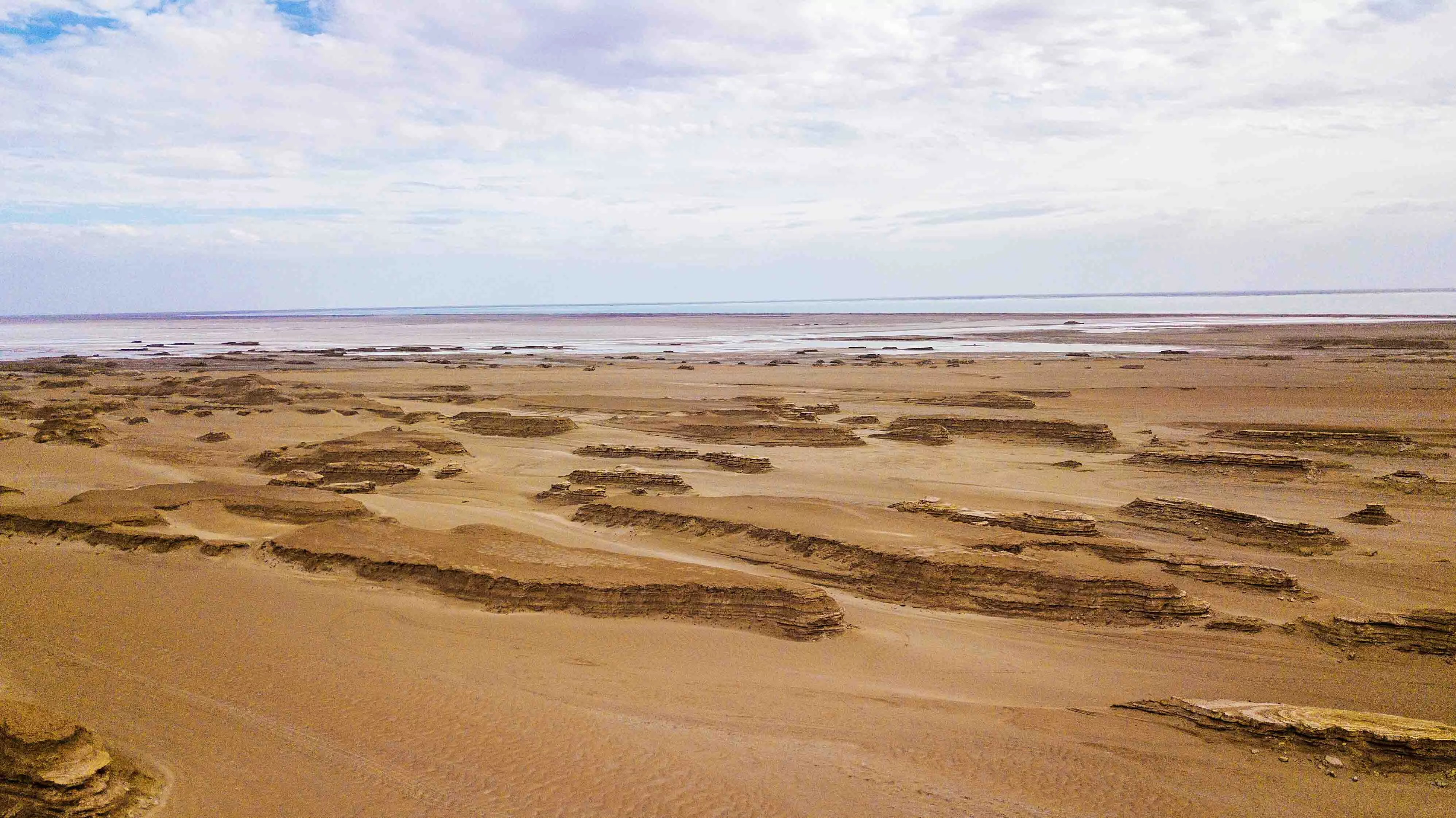 干旱區(qū)的湖泊,在形成歷史中往往包括反反復(fù)復(fù)的水進(jìn)水退,因而發(fā)育了上下疊加的泥巖層和沙土層。風(fēng)和流水可以帶走疏松的沙土層,對(duì)堅(jiān)硬的泥巖層和石膏膠結(jié)層卻作用有限。不過(guò)致密的泥巖層也并非堅(jiān)不可摧,荒漠區(qū)變化劇烈的溫差產(chǎn)生的脹縮效應(yīng)將導(dǎo)致泥巖層最終發(fā)生崩裂,暴露出來(lái)的沙土層被風(fēng)和流水帶走,演變?yōu)榘疾蹱?依然有泥巖層覆蓋的部分相對(duì)穩(wěn)固,形成或大或小的長(zhǎng)條形土墩,雅丹地貌的形態(tài)逐漸凸現(xiàn)出來(lái)。
