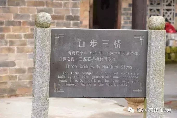 百步三橋是張谷英村的特色景點(diǎn)之一,這橋又叫“張谷英橋”。因?yàn)闃蚬灿芯哦?,每段由三塊條石組成,共二十七塊長條石,正好“張谷英”三個(gè)字的老式筆畫是二十七畫。這橋的的設(shè)計(jì),寓巧于拙,視石如術(shù),打眼穿榫.巧奪天工。
