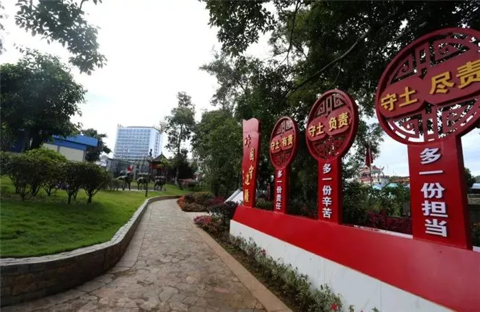 據(jù)介紹,國門公園是由鎮(zhèn)康縣商務局牽頭建設,融入了鎮(zhèn)康縣的歷史、民族、邊境文化??h委組織部根據(jù)“穩(wěn)邊固防、開放前沿”的主題,在公園內增添了代表黨建文化的建筑物,形成了“守邊固防、戍邊報國、開放合作、邊地文化”四個部分的黨建內容,使國門公園成了鎮(zhèn)康縣愛國感恩教育基地。“我們以122號界樁為主,在公園里加建了五聯(lián)共建雕塑墻、戍邊亭、報國亭等10余個紅色文化設施,進一步提升了國門形象?!辨?zhèn)康縣委組織部副部長周正偉說。