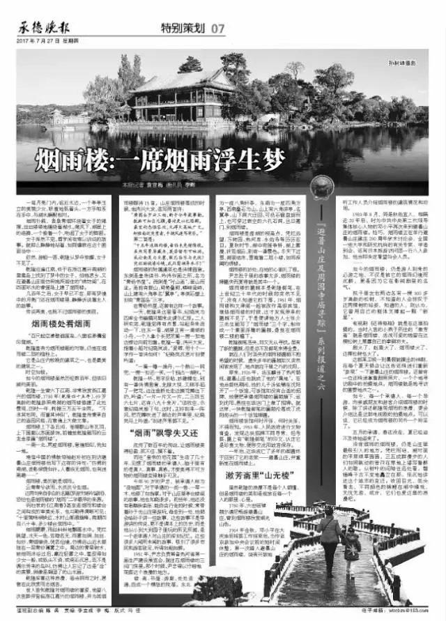而在“皇帝的后花園”生活了幾十年、見慣了煙雨樓的承德人,腦子里有的是真人、真事、真感,才使美得不可方物的煙雨樓變得觸手可及。