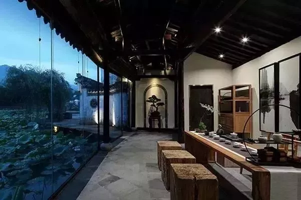 穿過玄關(guān),就是整個客房的精華所在——客廳、臥室一體的舒適空間。徽派建筑講究 " 暗室生財 ",所以屋內(nèi)是偏深的木色調(diào),但這一點不妨礙整個空間的采光。整排的落地木門盡可能的加大開面,空調(diào)和地暖同時供應(yīng),即使寒冷的冬季,開門看風(fēng)景也絲毫不覺寒冷。推門而望,徽山徽水風(fēng)情觸手可及。