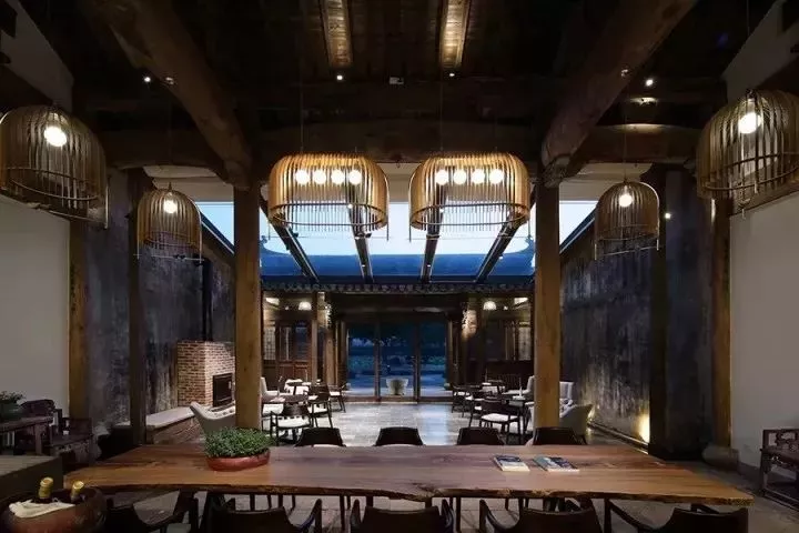 改造之初請了專業(yè)的設(shè)計師精心設(shè)計,通過一次又一次地磨合,將老宅一點一滴都保留最初的模樣,無論是白墻烏瓦、屋頂房梁、木門窗格、檐廊天井等等都盡可能多地展現(xiàn)徽派的元素,尤其是餐廳部分,蘇彤和設(shè)計師經(jīng)過不少的反復(fù)推敲呈現(xiàn)出如今令人震撼的效果,挑高的屋頂使空間顯得格外寬敞,樟木木梁減少了蚊蟲蜘蛛的困擾,延伸而出的玻璃房空間,坡面的玻璃屋頂使降雨時的污水沿著屋檐排出,并減少了屋頂垃圾的堆積。大開面的雕刻木門被保留下來,保證了屋內(nèi)的采光。別致的燈具被設(shè)計成鳥籠的形式,掛在木梁上意趣十足。